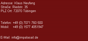 Den auf diesem Portal angebotenen Informationen kommen keinerlei Rechtsverbind-lichkeiten zu. Der Betereiber dieser Seite haftet nicht für Schäden, die durch die Nutzung des Online-Portals entstehen, ebenso wird keine Haftung für Folgen, die sich aus Informationen des Online-Portals www.impalasail.de ergeben, übernommen.